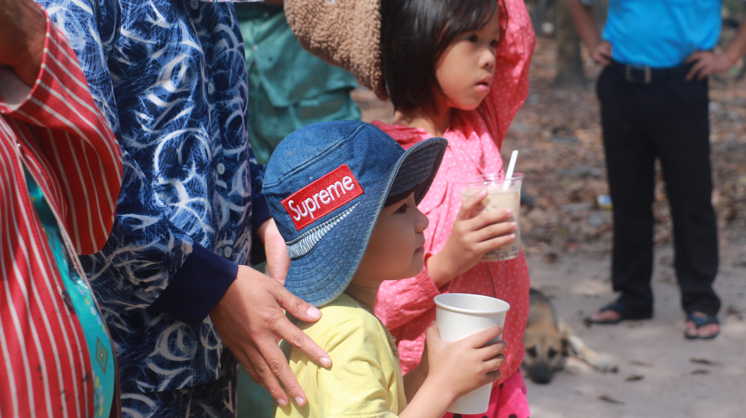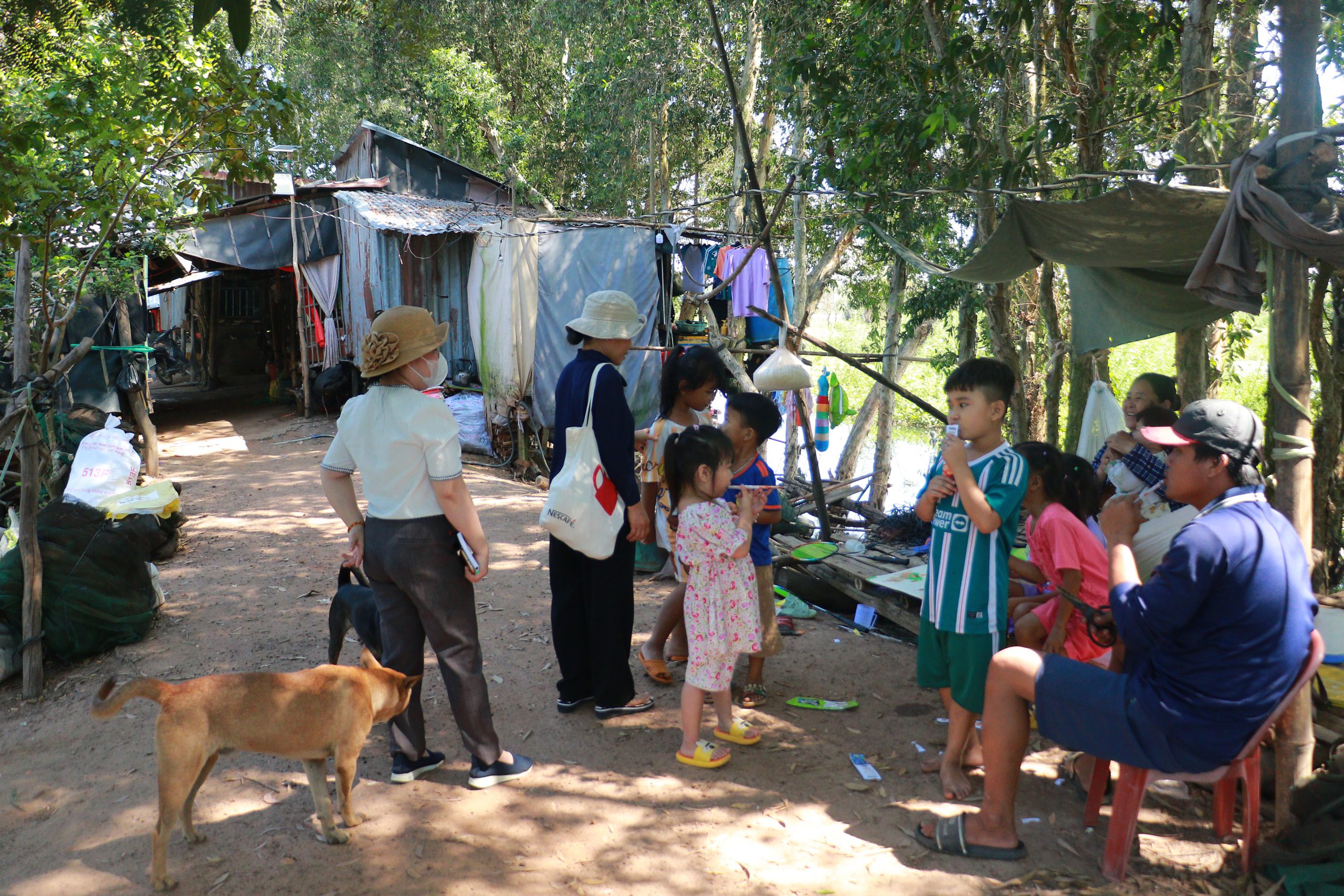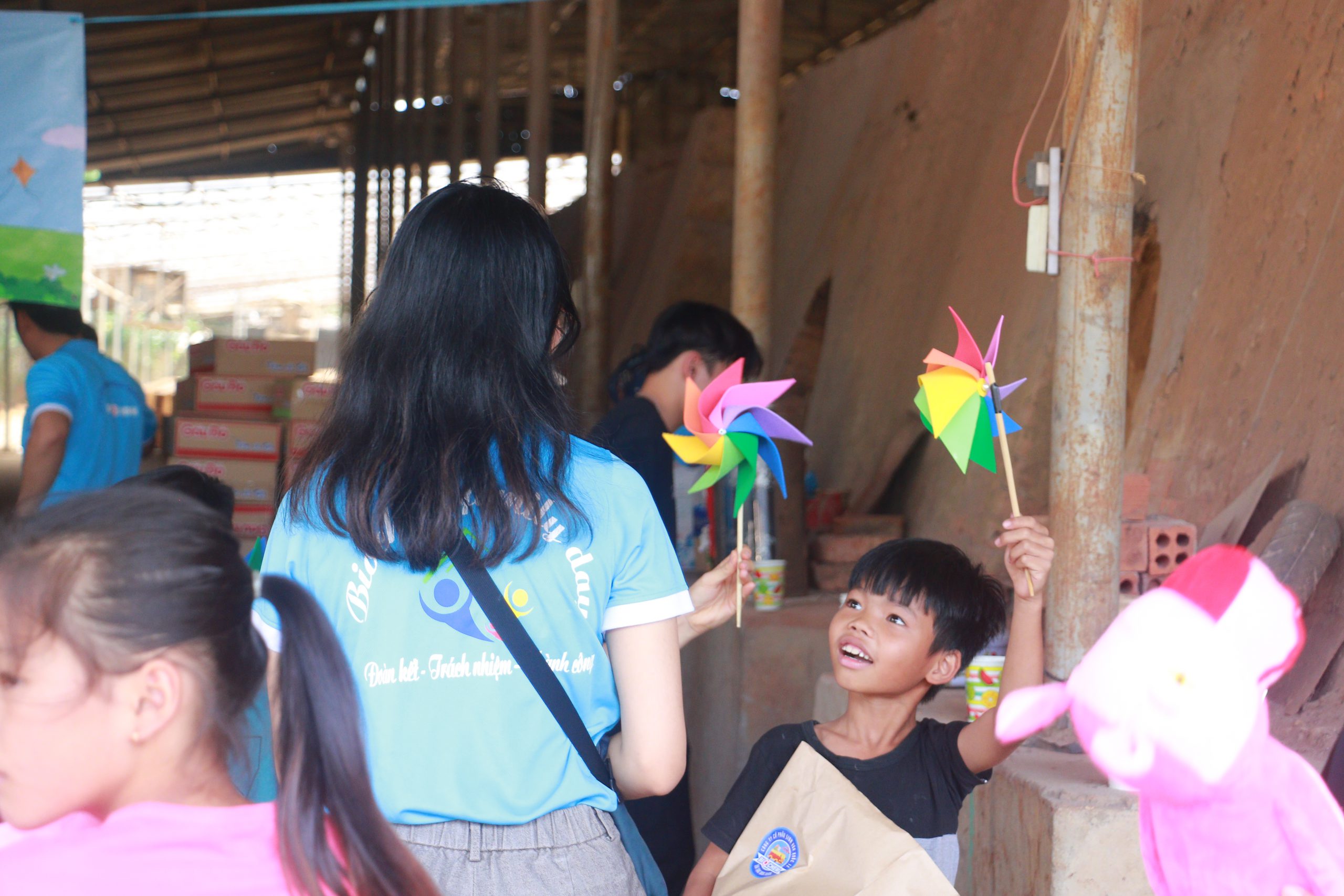 Sau khi ăn trưa, đoàn nhanh chóng đến nhà các sơ để phát quà cho các hộ gia đình và trẻ em nơi đây. Giờ cũng đã một, hai giờ chiều – khoảng thời gian nắng nhất ngày. Cũng may tại đây có mái che cho mọi người. Vẫn như cũ, quản trò không quên những trò chơi kết nối các em nhỏ. Trà sữa vẫn là món khoái khẩu nhất của chúng. Bởi trà sữa luôn phải đổ đầy liên tục.