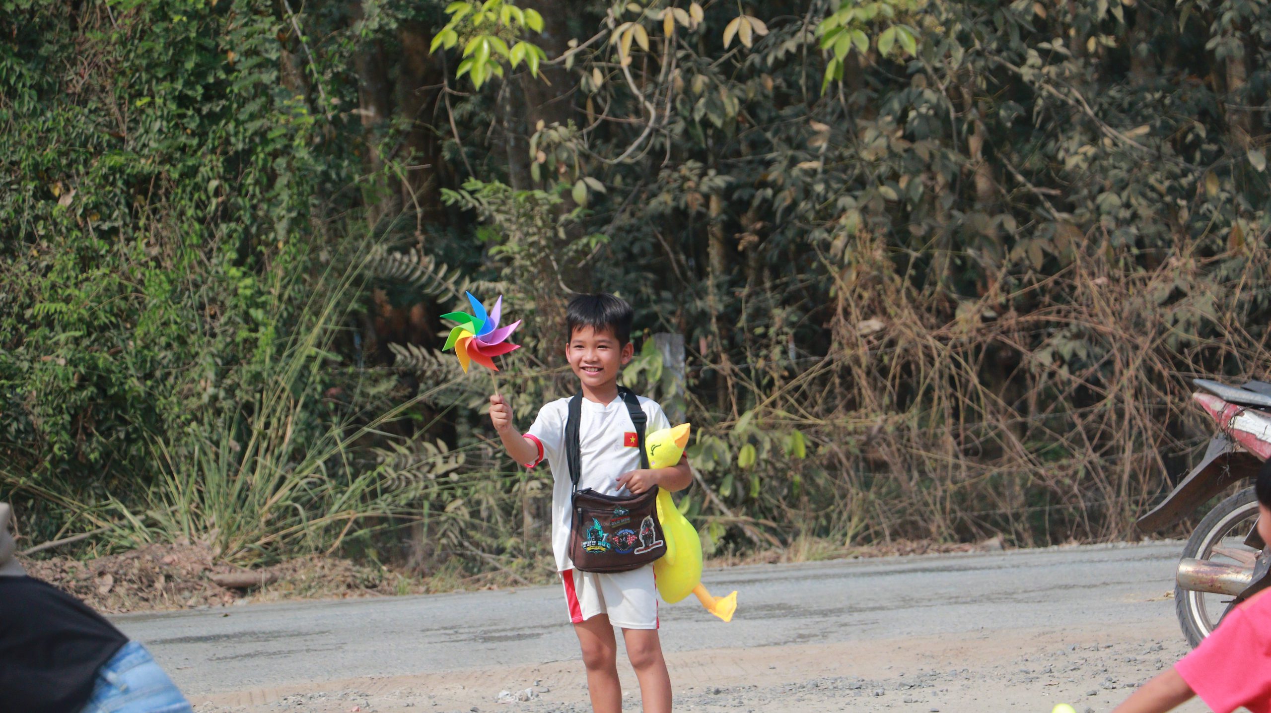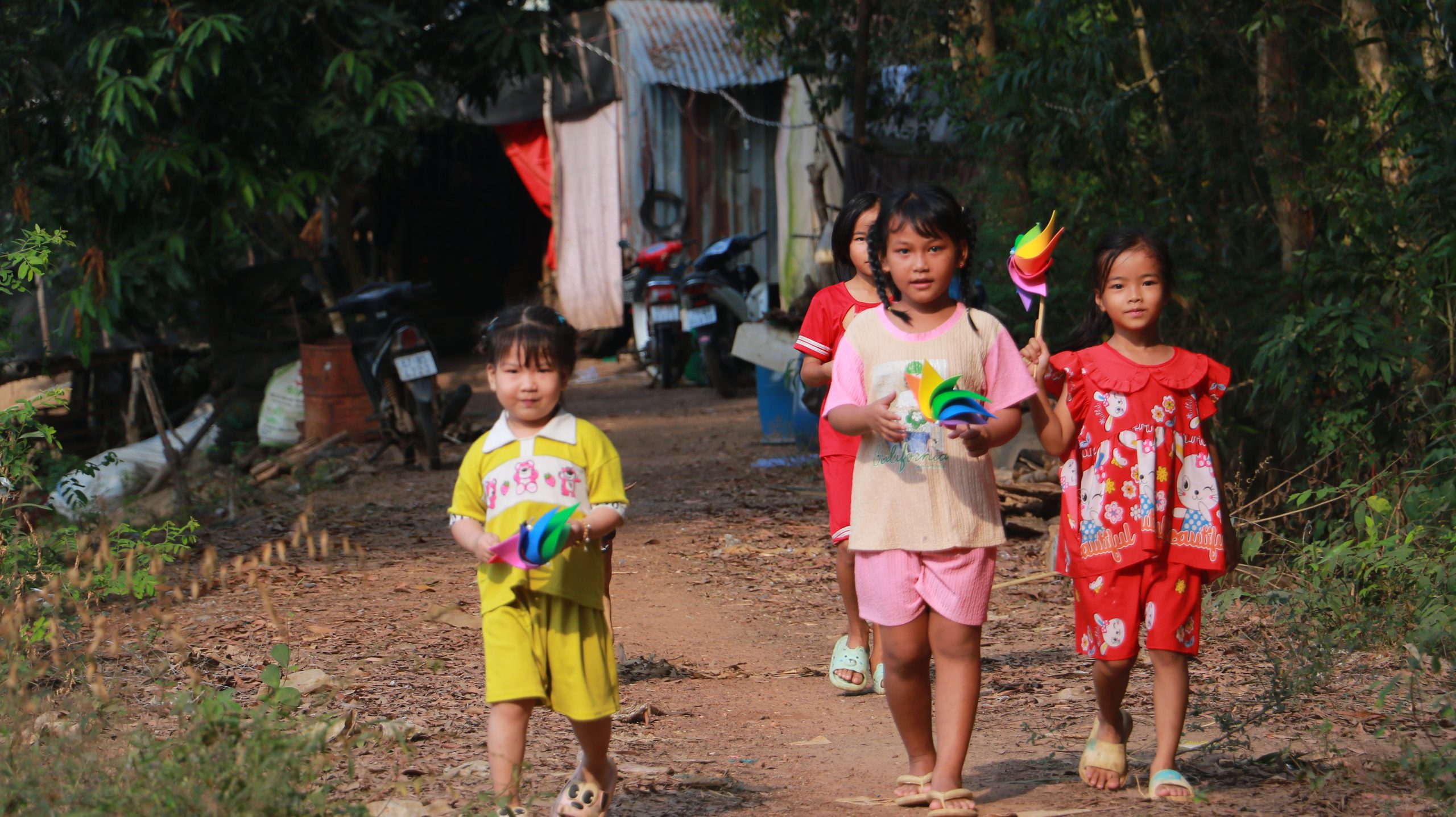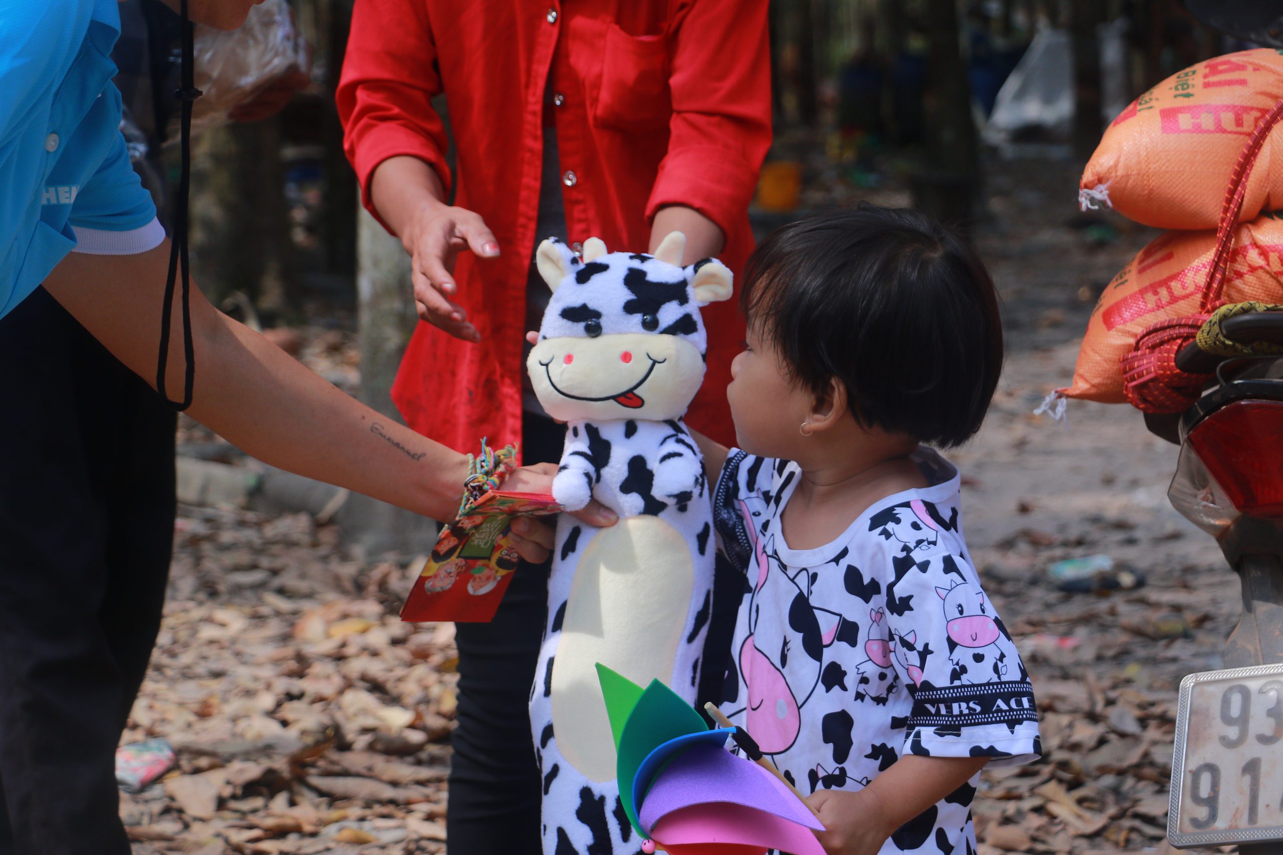 Với trẻ em, Biochem lại muốn mang một cái ‘Tết vui vẻ’ và tràn đầy tiếng cười. Vì vậy, chúng tôi đã cất công tự tay làm từng chiếc chong chóng đa màu mang niềm vui tới trẻ em nơi đây. Cứ như thế hơn 300 cái đã hoàn thành trong đêm để kịp chuyến xe đến Hớn Quản. Bên cạnh đó, mỗi phần quà trẻ em còn có các loại bánh, kẹo, rau câu, sữa, gấu bông và balo. Bên cạnh đó, chúng tôi còn chuẩn bị trà sữa để chiêu đãi các em.